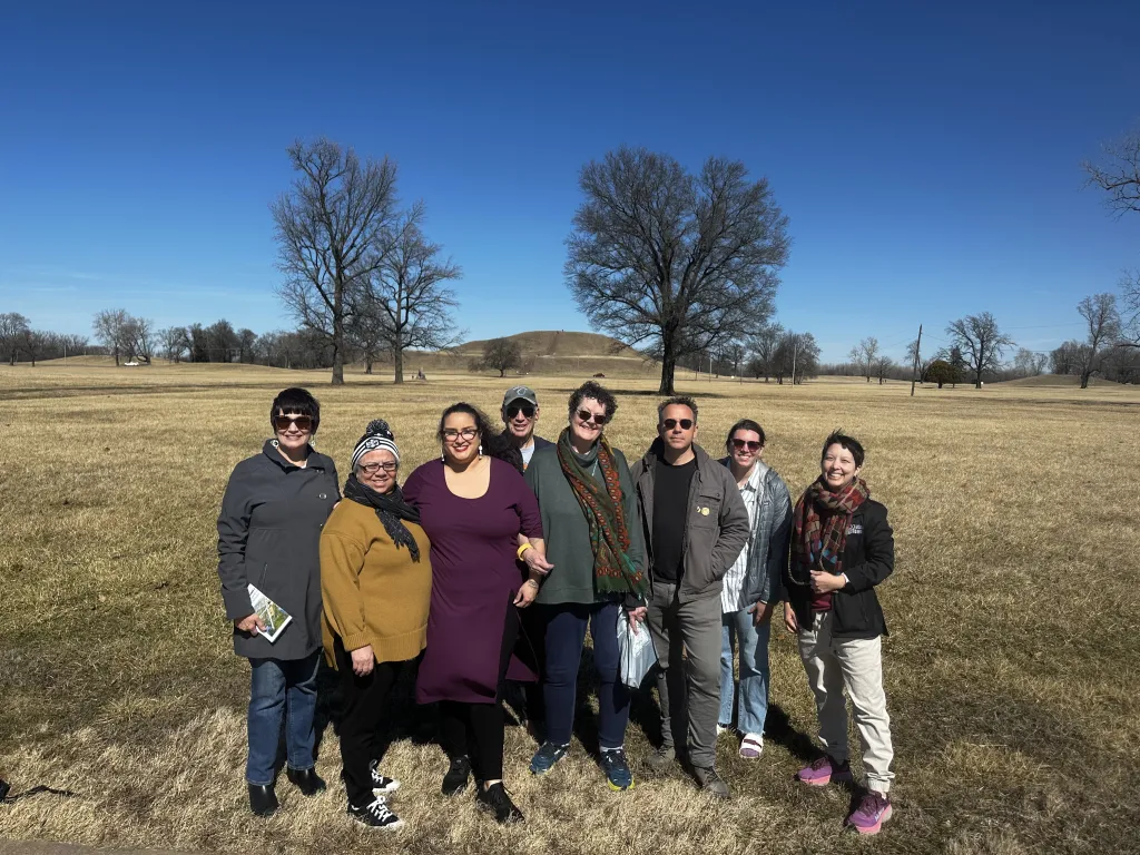 This year, we invited three influential Indigenous curators to campus to discuss their curatorial approaches, recent projects, and critical issues in the field. Dr. Heather Ahtone (Chickasaw/Choctaw), Director of Curatorial Affairs at First Americans Museum (FAM) in Oklahoma City, presented this year’s keynote address, “Indigenous Philosophy as Curatorial Methodology.” Dakota Hoska (Oglála Lakȟóta Nation, Pine Ridge, Wounded Knee), who was recently named the Inaugural Curator of Native American Art at the National Gallery of Art in Washington DC, spoke about her work curating the recent exhibition “Sustained! The Persistent Genius of Indigenous Art” at the Denver Art Museum, where she previously served as Associate Curator of Native Arts and NAGPRA coordinator. Dr. Meranda Roberts (Yerington Paiute/Chicana) is a Visiting Professor in the Art History Department at Pomona College and spoke about her work co-curating “Native Truths: Our Stories. Our Voices” at the Field Museum of Natural History in Chicago. The panel was complemented by tours of two exhibitions including works by Native American artists at the Kemper Art Museum by curators Dana Ostrander and Meredith Malone. The three visiting speakers also met with undergraduate and graduate students, toured St. Louis Art Museum’s collection with Dr. Alex Marr, Associate Curator of Native American Art, and visited Cahokia Mounds State Historic Site in Illinois and Sugarloaf Mound in St. Louis.